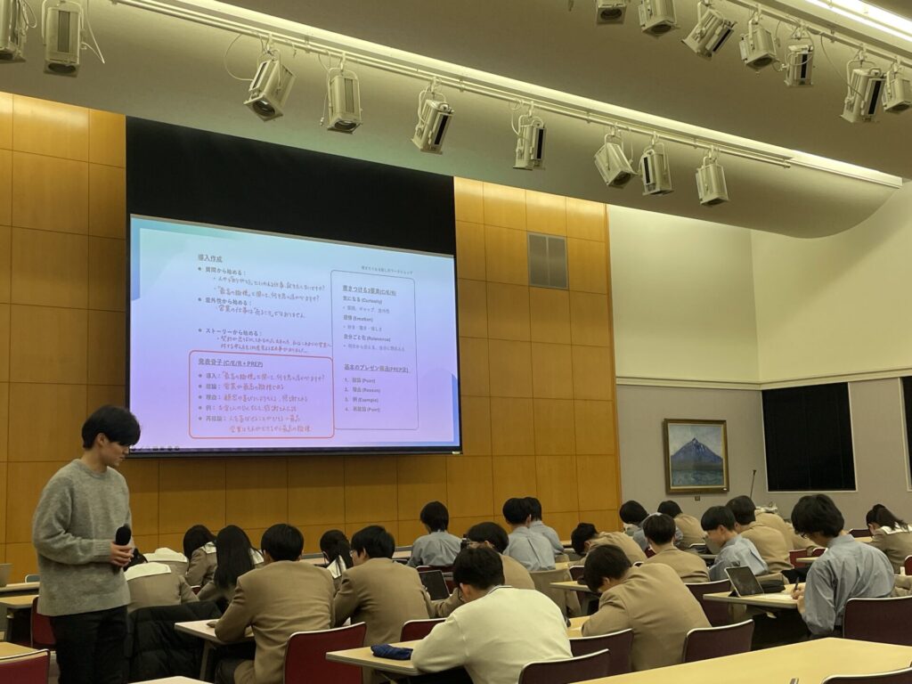 田中さんからは、人が興味を持つポイントや、伝わるプレゼンの基本的な構造について、大学での取り組みや実際の活動を交えながらお話しいただきました。生徒たちは、話を聞くだけでなくペアワークやミニプレゼンを通して、伝え方の工夫や難しさを実際に体験し、活発に取り組んでいました。