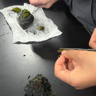 サロンはまず、「皆さんが身近に見ている苔はどれでしょう?」という問いかけからスタート。学校から駅までの通学圏内で見られる苔の姿の写真を見せながら、さまざまな苔の紹介をしました。その後、スライドを用いて、苔がなぜ土の上だけでなく木の幹や石の表面など、さまざまな場所に生えるのかを丁寧に説明してもらいました。さらに、苔には維管束がないにもかかわらず、どのようにして全体に水分を行き渡らせているのかという点についても解説してくれました。参加者からは「ヘェ〜そんな仕組みなのか」「苔ってすごい生命力を持っているんだな」といった感想も聞かれました。