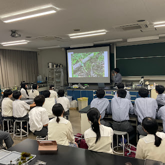 2025年10月14日(火)、名城サロンが開催され、コースの枠を超えて約40名の生徒が参加しました。今回の話題提供者は、SSクラス2年の齋藤陽歩さんです。「苔ってどこに生えるの?」という身近でありながら、奥深いテーマをもとに、苔の不思議な生態について分かりやすく紹介してくれました。