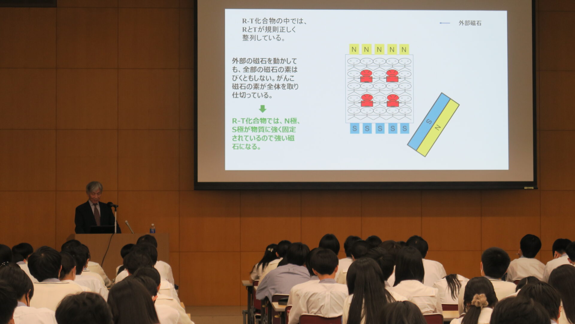 2025年9月30日、全校生徒対象の高大連携講座を開催しました。講師に名城大学 特任教授の佐川 眞人氏をお迎えして、「世界最強ネオジム磁石をどうやって見つけたか?」を演題に講演をしていただきました。