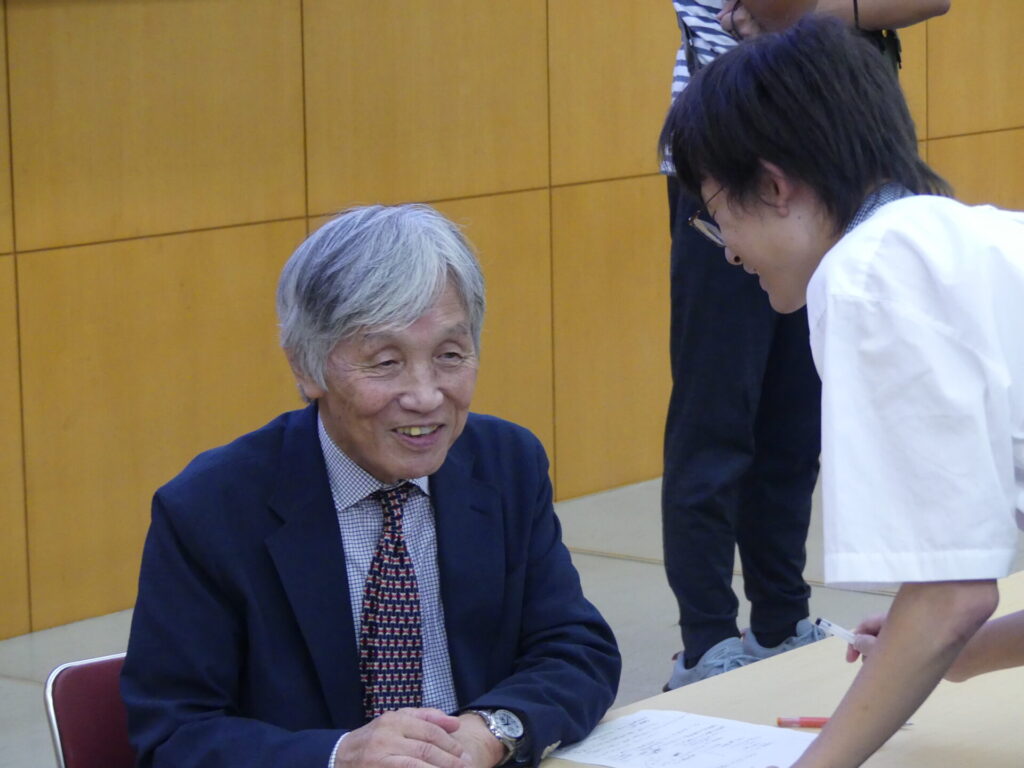 質疑応答では、会場の生徒から次々と質問が寄せられ、佐川先生に直接質問しようと長い列ができるほどでした。ネオジム磁石に関する専門的な質問から、生徒自身の探究活動に関する相談、さらには佐川先生の日常生活にまつわる質問まで、多岐にわたる内容が取り上げられました。また、講演後にはサインを求める生徒の姿も多く見られました。限られた時間ではすべての質問に答えきれないほどの熱気に包まれ、生徒の関心を大いに喚起する、実りある講座となりました。